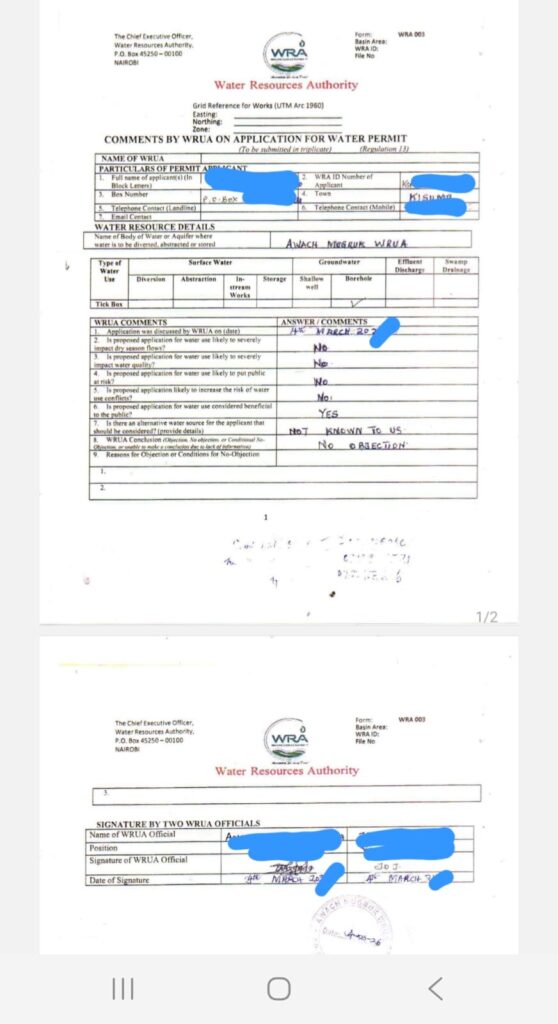 Before drilling, a permit is issued by WRA after careful vetting and documentations. Documents needed at this stage are a hydrogeological survey from a licensed hydrogeologist, land owernership documents such as a title deed, land sale or lease agreement, plot number, KRA pin certificate and copy of the national identity card or passport. A site visit is also done by WRA officials before a permit is issued. On average, it takes 7 to 1 month to get the approval.